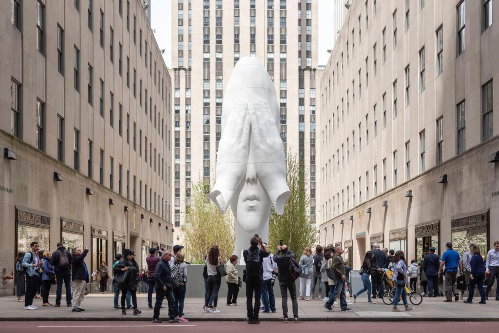 Immagine: Jaume Plensa, Behind the Walls (2018). Un volto di ragazza monumentale si copre gli occhi con le mani, in un gesto sospeso tra protezione e interdizione. Una visione mediata: guardiamo il mondo attraverso filtri che promettono accesso mentre decidono cosa resta invisibile