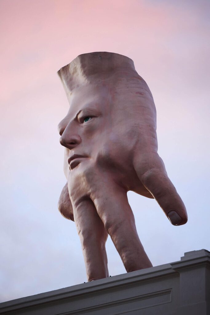 Immagine: Ronnie van Hout, Quasi. Una gigantesca mano con volto umano. Mostruosa, ironica, inquietante. Installata sui tetti di Wellington e poi Hobart. È una creatura ibrida: mano, faccia, autoritratto, idolo.